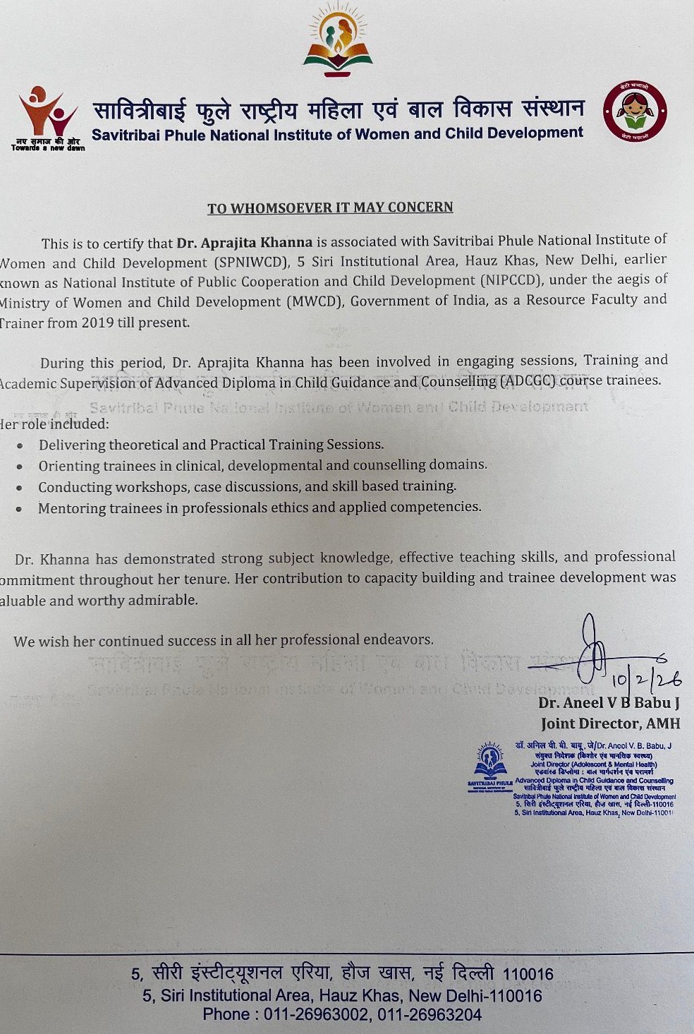 Honored to be associated with the Savitribai Phule National Institute of Women and Child Development (Ministry of Women & Child Development, Govt. of India) as a Resource Faculty and Trainer since 2019. Grateful for the opportunity to contribute to training, mentoring, and capacity building of future professionals in child guidance and counselling. Looking forward to continuing this journey of learning, teaching, and impact.